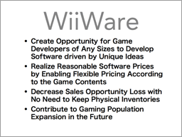 Almost a quarter of century has gone by since the home video game market was born. In the beginning, anyone could initiate game development with small risk. But time has changed things, and now, even when you have an excellent game idea, often times you cannot materialize and commercialize the idea due to the gigantic risk you face. There is no question that the existing model of packaged software sales will be an important sales method for this industry in the future as well. However, it has certain limitations in terms of pricing flexibility. Because of this, game developers are forced to include enough game content to sell the software at a certain price point even when that additional content does not significantly add in terms of user satisfaction. Looking at this from the perspective of customers who are buying games, it is natural that they are looking for a certain amount of game content with packaged software Under this circumstance, today there are few chances that a game like Tetris, which is very simple and small-sized but attractive to so many people, could make its way into the market. We have been preparing to introduce Wii Ware in order to establish a new sales model which can supplement the existing packaged software business.