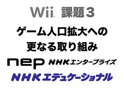 また、任天堂は、ゲーム人口拡大への新たな方向からの取り組みとして、新しい形の共同開発にも取り組んでいますが、このたび、任天堂では、NHK・日本放送協会さんの承認のもと、非常に幅広い日本のお客様を対象とした巨大なライブラリをお持ちのNHKさんが蓄積されたコンテンツを使用したゲームソフトの開発を、株式会社NHKエンタープライズさん、株式会社NHKエデュケーショナルさんと共同で進めております。