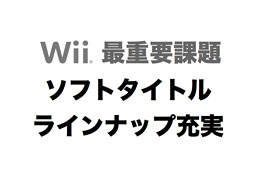 そして、Wiiにとって最も重要な課題が、「ソフトタイトルラインナップの充実」です。携帯型ゲーム機と比べると、据置型ゲーム機では、ソフト開発が大規模になるため開発に時間がかかるということもあって、DSよりWiiの方が、ソフトメーカーさんのタイトルラインナップが充実してくるのに時間がかかっています。DSのときには、発売2年を経たずにソフトメーカーさんのタイトルがかなり充実してきていたのに対し、Wiiではそれが感じられないと、気を揉まれているファンのみなさんの声も耳にしています。