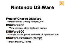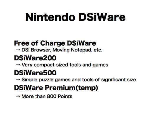 The "Nintendo DSiWare" can be categorized into roughly 4 categories: Other than DSi Browser and Moving Notepad and other software that Nintendo offers free of charge, there will be "DSiWare 200" that you can purchase at 200 Points, "DSiWare500" at 500 Points, and "DSiWarePremium" that requires 800 Points or more. For DSiWare200, we are planning to offer very compact utility types of applications and small games, and for DSiWare 500, simple puzzle games and other more sophisticated utility tool application.