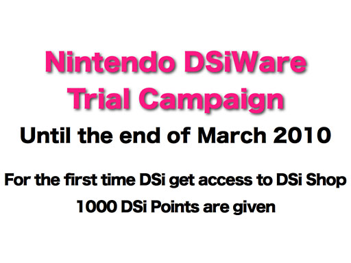 So that as many of our consumers can experience the DSi Ware download by accessing DSi Shop, we will conduct DSiWare trial campaigns to provide consumers with 1000 Nintendo DSi points when they purchase DSi and get access to DSi Shop. This special offer will run through the end of March 2010. We really hope you will experience the joy of creating your own or MY DS by downloading your favorite DSiWare to your Nintendo DSi, but we will announce the details at the next opportunity. As for the detailed lineup of DSiWare, we are planning to announce it in the near future, but I'd like to show some of them today.