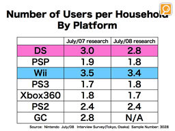 Besides the wide-spread user demographics, DS has another unique characteristic. It has the highest number of users per household as a portable video game machine. Though the number was slightly lower than when we researched the last time, the most recent research shows 2.8 people in one household use DS on average.