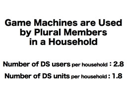 As you know, portable game machines are played by multiple members within one family. While 2.8 people per household are touching DS, one household has 1.8 units of DS on average.