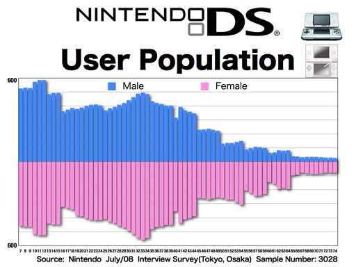 The most recent survey we conducted reveals a Japanese DS consumer composition just like this. The graph covers 7 years old from the left, to 74 years old to the right.