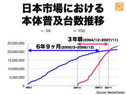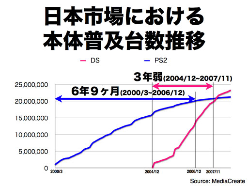 これに対して、ニンテンドーDSは発売から3年弱で、2000万台に到達していることが、普及のペースのスピードを表していると思います。