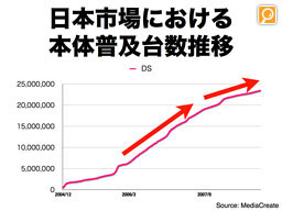従来のゲームビジネスの常識では、日本市場における2000万台は、ほぼ普及の限界台数であると言われており、すでにDS市場は飽和したと見ておられる方も少なくないようです。しかし、一時よりも普及のペースは落ちついたとはいえ、DSは今でもこれまでの主流プラットフォームの普及期に遜色ないペースで売れていることも事実ですし、幅広いお客様に支持していただけていることを活かして、携帯型ゲーム機独自の新しいライフスタイルがご提案できれば、ニンテンドーDSというプラットフォームには、まだまだ普及の余地があると考えています。