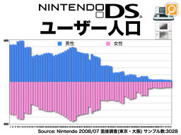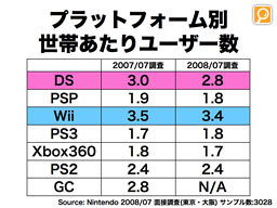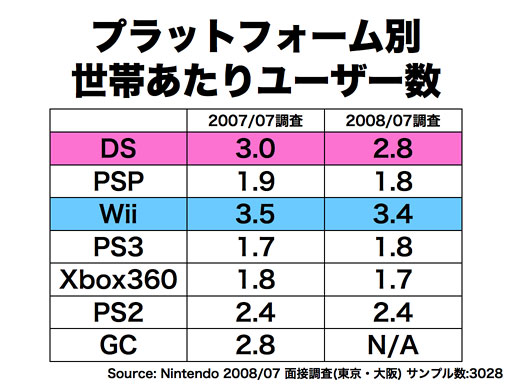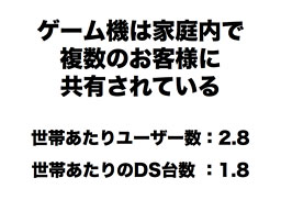 その一方で、携帯ゲーム機は家庭内で複数のお客様で共有されています。1世帯当たり平均2.8人のお客様がDSを触ってくださっていますが、世帯あたりのDSの台数は1.8です。