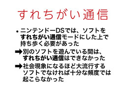 すれちがい通信は、ニンテンドーDSでもおなじみで、『nintendogs』で任天堂が初めて提案し、『ドラゴンクエストIX』で昨年、社会現象にもなりました。『ポケットモンスター ブラック・ホワイト』の発売後は、再び、活発に使われているようです。 -