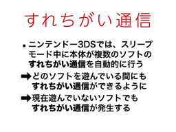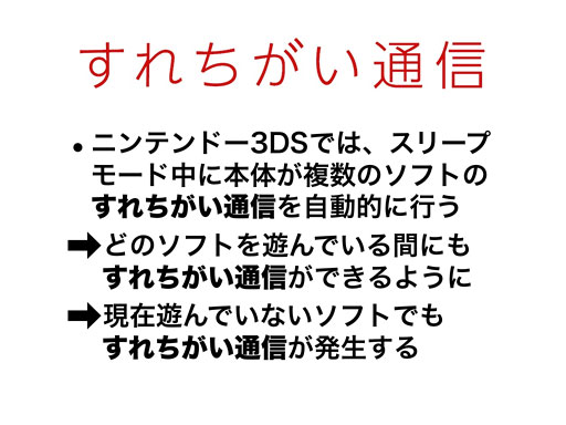 ニンテンドー3DSでは、スリープモード中に本体自体が複数のソフトのすれちがい通信を自動的に行うようになりました。これは、本体システムで行う機能で、各ゲームソフトの機能ではありませんから、どのソフトを遊んでいる途中であっても、それぞれのソフトのすれちがい通信ができるようになりました。ニンテンドー3DSでは現在遊んでいないソフトでも、過去に遊んだことのあるソフトのすれちがい通信が発生しますので、いろいろなソフトのすれちがい通信が発生することになると考えています。