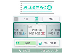 また、ニンテンドー3DSには、3DSを持ち歩いた歩数や、ソフトで遊んだ時間が一覧で確認できる「思い出きろく帳」という機能もあります。