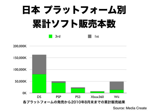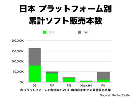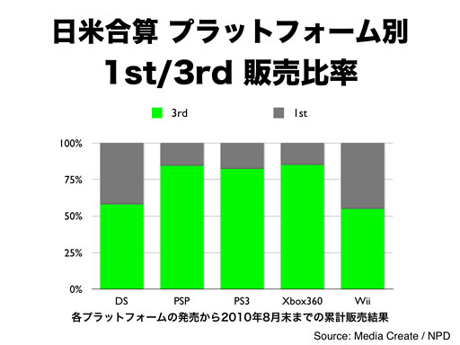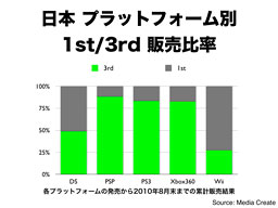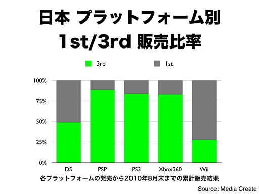 ご覧のように、日本では、任天堂プラットフォームのサードパーティ比率は相対的に低いことは事実で、特に、Wiiのサードパーティ比率は非常に低くなっています。