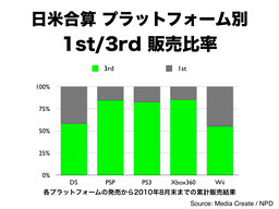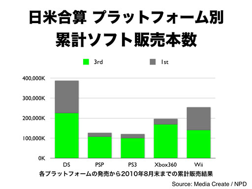 ちなみに、日本だけでなく、日本とアメリカの販売データを合算すると、様子はだいぶ変わってまいります。日本に見られるようなWiiとDSのサードパーティ比率における大きな差は、ここにはありませんし、