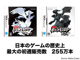そして、発売された『ポケットモンスター ブラック・ホワイト』は、これまでの『ポケットモンスター』シリーズの中で過去最高の初動となりました。それだけではなく、2タイトル合計で、DSソフト最大の初週販売数となり、過去のデータを全て調べてみても、日本のゲームソフトの歴史上最大の初週売上となる、255万本を記録しました。