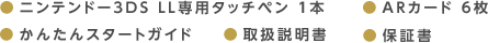 ●ニンテンドー3DS LL専用タッチペン 1本 ●ARカード 6枚 ●かんたんスタートガイド ●取扱説明書 ●保証書