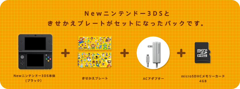 Newニンテンドー3DSときせかえプレートがセットになったパックです。Newニンテンドー3DS本体(ホワイト)+きせかえプレート+ACアダプター+microSDHCメモリーカード4GB
