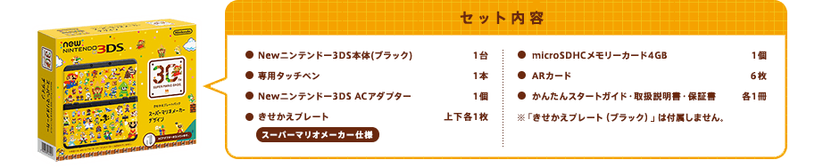 セット内容Newニンテンドー3DS本体(ブラック)1台/専用タッチペン1本/Newニンテンドー3DS ACアダプター1個/きせかえプレート スーパーマリオメーカー仕様 上下各1枚/microSDHCメモリーカード4GB 1個/ARカード6枚/かんたんスタートガイド・取扱説明書・保証書 各1冊/※「きせかえプレート(ブラック)」は付属しません。