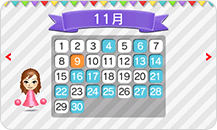 Miiとすれちがうと、その誕生日がチェックされて、カレンダーの日にちに色がついていきます。