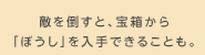 敵を倒すと、宝箱から「ぼうし」を入手できることも。