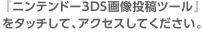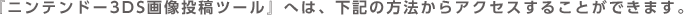『ニンテンドー3DS画像投稿ツール』は、ゲーム内やHOMEメニューを撮影した画像をTwitter、Facebookのソーシャル・ネットワーキング・サービス(SNS)へ投稿することができるWebサービスです。 このサービスを利用すると、撮影した画像にコメントやハッシュタグを付けて家族や友達などと共有することができ、複数のSNSへ同時に投稿することもできます(Twitter、Facebookをご利用いただくには、それぞれのサービスでアカウント登録が必要です)。