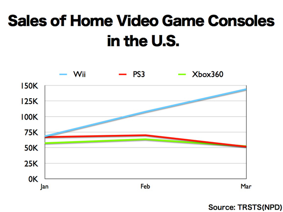 The January Wii sell-thru data cannot be a good point for fair analysis as Wii was facing the serious supply shortages then. Contrary to the Japanese situation, Wii sales were accelerated in March.