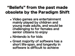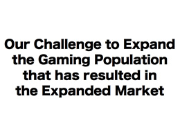 I showed this slide a year ago at our annual financial announcement briefing, but, in the past, there were dominant opinions in this market that video games are entertainment mainly enjoyed by children and young male adults and that females and senior citizens would hardly play. Also in the past, we often heard from people inside and outside this industry that they thought Nintendo was for kids. Further, it had been taken for granted in this industry that great majority of software has a short life-span and that software with longevity is hard to make. However, today, these ideas cannot be applied to the business of DS and Wii.