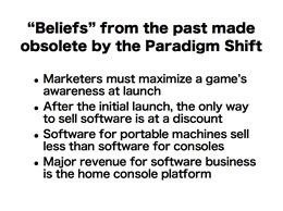 Also, Nintendo has yielded some results by taking somewhat different marketing approaches from the traditional ones that marketers must make much of the pre-launch PR activities in order to maximize a game's awareness at launch because software has very short life-span on the market. Such beliefs as "After the initial launch, the only way to sell software is at a discount", "Software for portable machines sell less than software for consoles" and "Major revenue for software business is the home console platform so that portable games cannot play the major role in software business" have already become obsolete due to the big change in the market caused by game population expansion.
