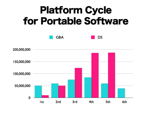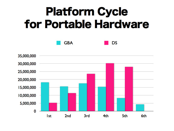 GameBoy Advance was sold in the traditional video game market, before the market expansion took place. GameBoy Advance started off with a great start from its first year and showed rapid decrease in its 5th year on the market. This GameBoy Advance's sales trend might be the background for "Portable Hardware's 4-year life-span" theory.