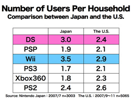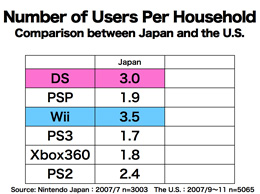 Last fall, I talked about the result of the Japanese survey. In the past, it was 2.2 to 2.8 people for a home console game machine and 2.0 people for a portable machine, but Wii has 3.5 users and DS has 3.0 users in a household, both of which are record highs.