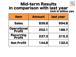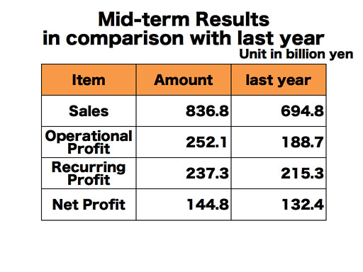 The operational profit was 252.1 billion yen, and the recurring profit was 237.3 billion yen. As for the mid-term net profit, mainly due to the increase in the recurring profit, it was up to 144.8 billion yen. For all these accounts, we have achieved record high mid-term results.