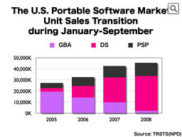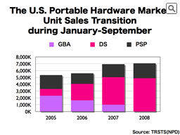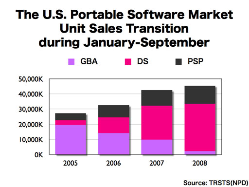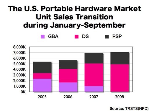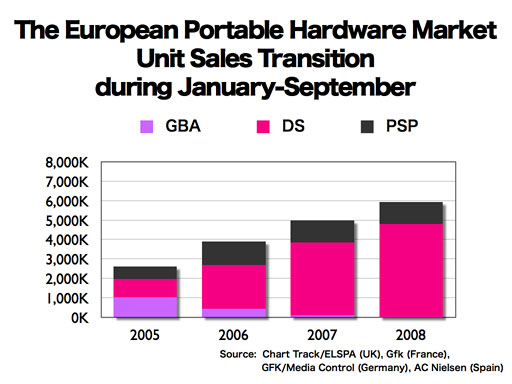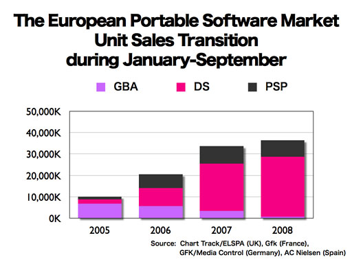 In this graph, we have gathered and tallied the data disclosed by independent research companies in the UK, France, Germany and Spain and are comparing the portable hardware sales during January-September periods from 2005 to 2008. As it is assumed that these four countries represent 75% to 80% of the total European market, I'd like to focus upon these figures to discuss the pan-European trend. DS showed another 27% increase this year. Back in 2005, the European portable hardware unit sales were about half of that in the U.S. Given the fact that these four countries now represent little less than 80% of the pan-European market, Europe now appears to have surpassed the American market.