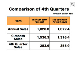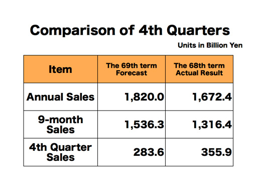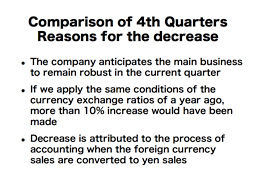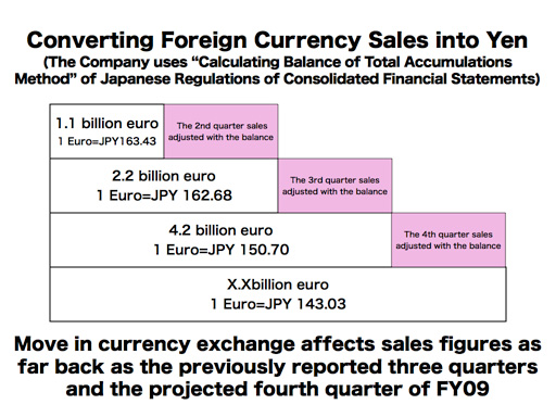 However, for the purpose of accounting procedure, we convert the non-Japanese-yen sales to sales in yen. Due to the recent sharp appreciation of the yen, our sales appear to have decreased in our final reporting in Japanese yen. Two elements are overlap to make the yen’s sales decrease appear larger. One is that we are anticipating a higher appreciation of yen in the current fiscal quarter in comparison with the final quarter of last fiscal year. This reason is rather obvious, but here is another element which maybe a bit more difficult to comprehend. The foreign currency exchange rates applied to the current fiscal quarter not only affects the final three months but also the entire twelve months of the fiscal year and, therefore, significantly decrease the 4th quarter sales when the 4th quarter sales are calculated by subtracting the 9-month result from the annual result. Well, I myself could not fully comprehend this point until Mr. Mori explained to me, so I’d like to take some time to explain a bit further.