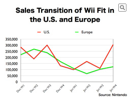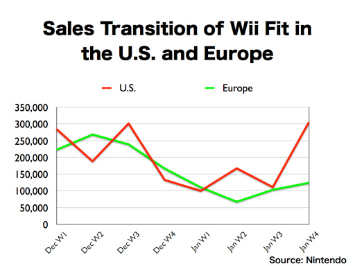 In general, December is the month when the largest number of software is sold in a year, and software which launch at the end of a year show a significant decline in sales at the start of the new year. In the case of typical Nintendo titles, January sales are often 20 to 30% of the preceding December sales. Wii Fit, however, is clearly showing exceptional sales transitions. Last week in the U.S., more than 300,000 Wii Fit software were sold, which is an unbelievable figure with the year-end sales season already over. When we compare the 4 weeks in this January with the same 4 weeks in December 2008, American sales level of Wii Fit in January is more than 75% of December and Europe is keeping more than 40% pace.