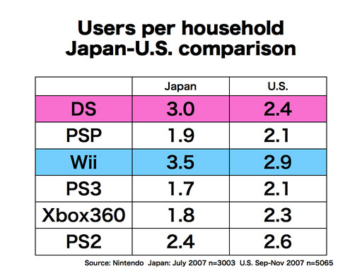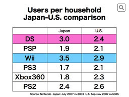 In the U.S., users per household of Wii has increased to 3.4, which has now become equal to Japan and marks a stark difference from other platforms.
