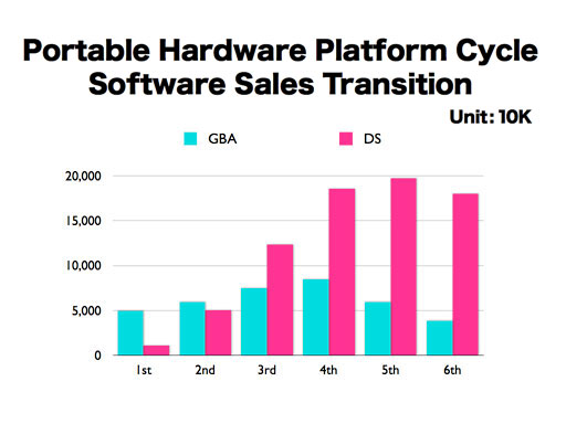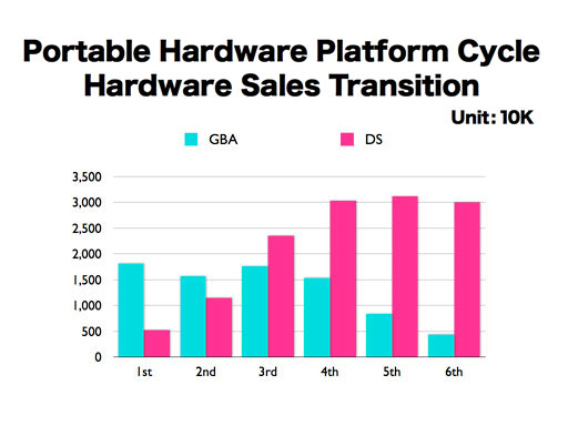 Iwata: Before publicly disclosing our internal surveys in this fashion today, I myself have considered many things.and, as a matter of fact, have thought that some may question its credibility and ask us whether the company was manipulating the result to our favor. First, I myself have been involved and concerned about the accuracy of the survey results with extreme attention. To tell you the truth, our U.S. subsidiary had conducted a different survey once, prior to the ones I showed you today, but it did not provide the accuracy that I was looking for. Let me tell you how we are checking the account. We are asking about 3000 people in Japan and 4500 to 5000 people overseas to cooperate. Whether they really represent the entire citizens in the country or not matters most in order for us to make management judgments. If they were biased, the results of the sampling survey can never show a meaningful gaming population transitions at all. Here is an effective way to check the accuracy: Because we can learn (from survey results) many things including who owns which hardware or uses at home, we compare how the survey result measure up against the installed base of the hardware with the sell-thru data of that hardware. If the balance is within a certain range, we can tell that those who were sampled represent the entire population. If the accuracy is not within the predetermined range, we can tell that we have chosen the wrong people for the purpose of the survey. We have been paying special attention to this point. Accordingly, the surveys have not been biased as you might be concerned to those who are Nintendo's loyal customers or who appreciate games (and not the ones who do not play anymore). We have been checking the accountability of the survey with a variety of different ways and now have become able to come up with survey results with a certain level of accuracy. What I have shared today are the results of the surveys only after we thought that we were starting to come up with accurate ones. So, as the premise, let me confirm that we are confident about these survey results. As a matter of course, there is no guarantee that anybody who has purchased a video game hardware will continue playing with it. This is not anything new, nor did it start with Wii or Nintendo DS. As you might recall, when NES, Super NES or Sony's Playstation was leading the market, people brought out their game systems from the closet in order to play with a Dragon Quest software after its launch, just to put away the system after playing the game through to the end. Of course, whether or not a game hardware is actively used is of great concern to us so we investigate it. You may have some vague assumptions that those who started playing video games with Brain Training or Wii Fit must have stopped playing with any video games as soon as they got tired of these initial software and that those who have been long gaming fans must continuously be playing one game after another. Well, the actual situation is not that simple. We are, in fact, using several other data in our variety of analysis, including the data obtained through our Club Nintendo, and we have come to understand that there has never been a situation where people who started playing video games with any particular game tend to quit playing soon. Regardless of the first software, those who continuously purchase additional software maintain their active game plays, and those who opt not to purchase software repeatedly will stop playing. Likewise, we have not been able to identify any particular software, of which its purchase discourages the player to play frequently or becomes the primary cause for the purchaser to stop playing. In other words, when people stop playing with video games, they do so without any apparent reason. Nintendo has been doing a number of researches about what degree and frequency our customers stop playing video games and how we can rebuild the market by offering new proposals with what intervals (in order to once again encourage those who quit to resume their game plays or prevent those who are going to drift away from doing so). We have yet to come up with any concrete answers yet. At least, it appears to be not as simple as you said that software dealing with health or brain training tend to be a short time fad with a big risk of going in and out of style easily. Video games are, or any entertainment commodities are, supposed to go in and out of styles easily so we must periodically make new offers. If we fail to offer new proposals, a good market condition today can instantaneously turn into a very bad one, which is characteristic of this industry. In the past, there were so-called platform cycles for the video game hardware. It was said that 4 or 5 years for a portable hardware and 5 or 6 years for a home console hardware were the platform cycles, within which new hardware are sold and gone. This graph shows the sales transitions of Game Boy Advance and Nintendo DS each year from their launches. The right end of Nintendo DS is our forecast, so it is not realized yet, but do you think if these two hardware are showing identical cycles? I think they are completely different. Similarly, the software for these platforms shows different sales trends. When the customer base has largely expanded and the expansion is happening at a different trajectory, the past platform cycle should not be automatically applied to the current platform. Of course, we have no intention of disbanding our hardware teams since we do not think that Nintendo DS and Wii will last forever. Our internal hardware teams are always researching and working on new hardware so that we can launch them whenever we find an very interesting idea that can make people all over the world to feel like purchasing our new hardware just to play with the software, or when Nintendo or third parties developers come to the conclusion that, after all these different endeavors, ther
