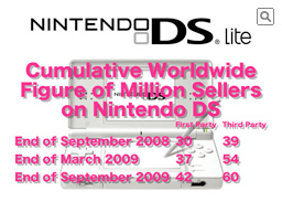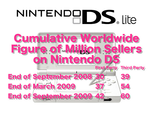 As of the end of September this year, Nintendo DS titles which had shipped more than a million units increased by five from first party that includes Nintendo and Pokémon, and by six from third party. Lifetime numbers are 42 from first party and 60 from third party.