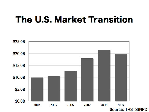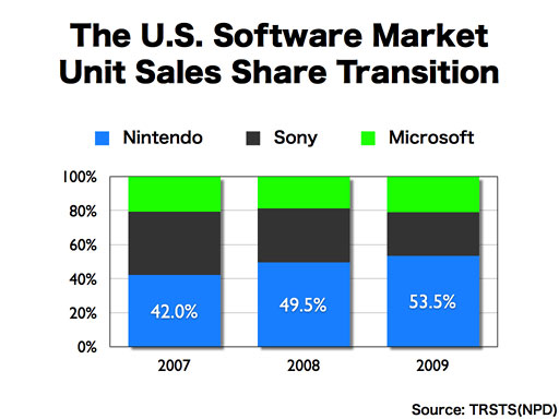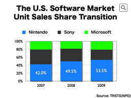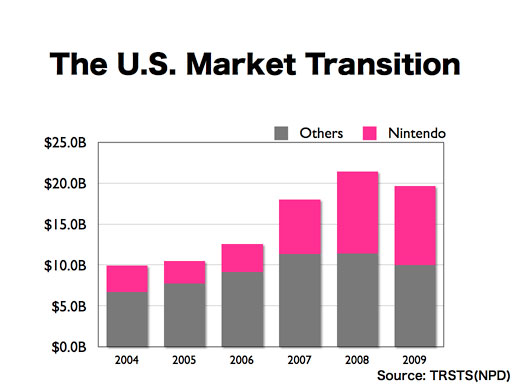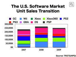 This chart shows dollar-sales transitions, not unit sales transitions, of the U.S. market based on NPD data, which not only include the sales of hardware and software but also the peripherals. When compared with 2004, the U.S. market has grown to be more than twice as large in 4 years. In 2009, however, as NPD has already reported, the U.S. market showed a sales decline due to the decreases in hardware and software sales and to the decrease in dollar sales per unit because of hardware price cuts.