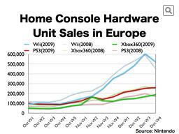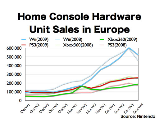 Similarly to the U.S., until the year-end sales season showed significant excitement in the marketplace, sales of Wii had not been very good in Europe in 2009. There was even a time when all the three home consoles showed similar sales, and it was when Activision launched its smash hit, "Call of Duty," in mid-November. Because Wii did not show a significant sales increase immediately after the trade price cut in Europe, the atmosphere surrounding the system must have not been very positive until amid the year-end-sales season. Nintendo of Europe launched the Black Wii console in the 3rd week of November. Simultaneously, it launched New Super Mario Bros. Wii. The situation started to change from around this point, and the sales thereafter were close to that in 2008, when great sales results had been achieved.