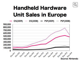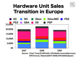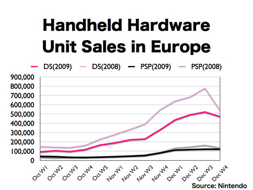As for Nintendo DS hardware in Europe, it had shown explosive sales during the year-end-sales seasons in both 2007 and 2008, but 2009 year-end-sales season did not show as large of an uptick. Obviously, however, it was not due to the increases in sales of other platforms. Nintendo DS did not have a very strong software lineup at the end of 2009. Consumers may have compared Nintendo DS with Wii which had several hit titles and, as a result, might have ended up paying less attention to Nintendo DS.