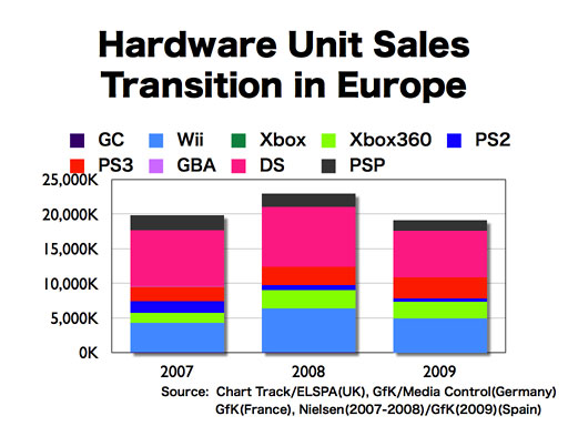 In 2008, the European video game market grew significantly. In 2009, however, the entire market size went back to the 2007 level. Unlike the U.S., sales of both Nintendo DS and Wii, together with a number of the other platforms, decreased.