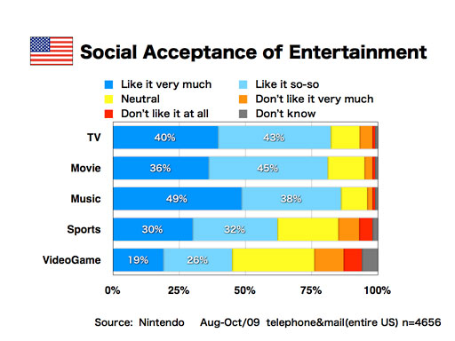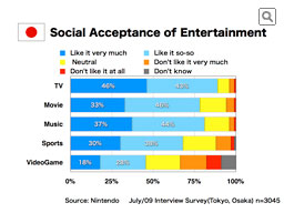 When we conducted our survey on the Japanese gaming population, we also researched the way Japanese people appreciate and accept forms of entertainment. So many people responded by saying that they like TV programs, movies, music and sports very much or like them to some extent, and few of them said they don't like them at all. When it comes to video games, while it seems that the public perception towards video games has significantly improved over the past few years thanks to the expansion of the gaming population, the ratio of people who responded with favorable answers was less than those for other forms of entertainment, and there are still many people who didn't like video games at all or who have no idea as to what video games are all about. One of our mid-term goals of gaming population expansion is to improve the social acceptance of video games to the level comparable to these other form of entertainments.