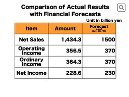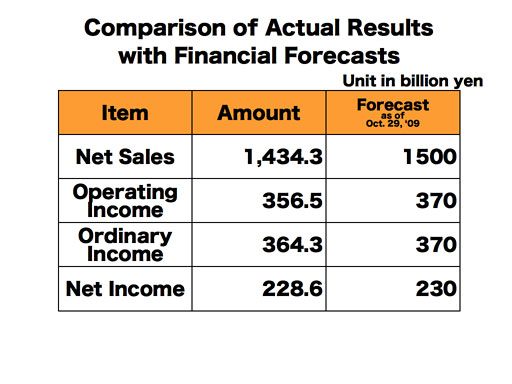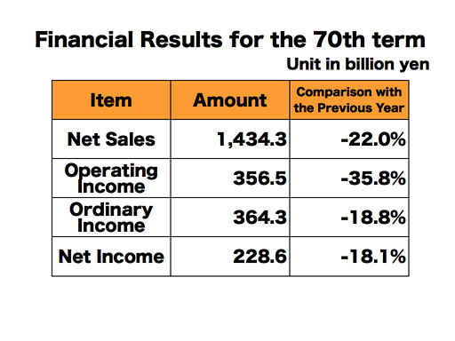 The consolidated net sales for the 70th term ending March 2010 were 1 trillion 434.3 billion yen, down 22% from the previous year. The operating income was 356.5 billion yen, down 35.8% from the previous year. I’ll explain the background for the decreases in the sales and the operating income later. Ordinary income was 364.3 billion yen, which was 18.8% down from the previous year. The reason why the rate of decrease for the ordinary income is smaller than that for the operating income was because, last year, a significantly stronger Japanese Yen especially against euro in comparison to two years ago had resulted in large amount of foreign currency reevaluation loss over the company’s assets held in foreign currencies, while we had very little foreign exchange losses for the subject fiscal year. As a result, the net profit for the subject fiscal year was 228.6 billion yen.