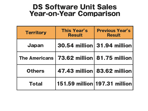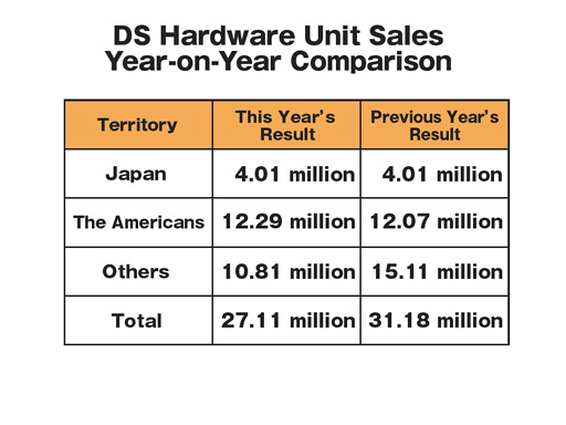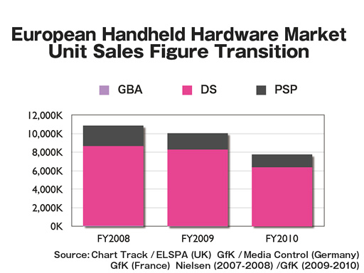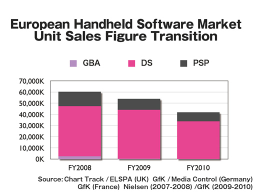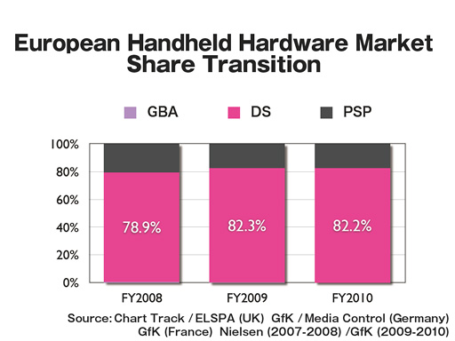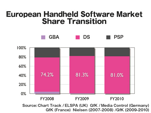 I want you to elaborate on your DS business in Europe. According to the software sales charts, the software business was very healthy with previously-released titles like Brain Training in 2009. But in 2010, they have totally disappeared. Why did the European market change so rapidly and significantly? As for Japanese DS market, I find it is recovering with hits like Tomodachi Collection after a moment of faltering out. I believe it would be critical to leverage the European market, aside from launching 3DS. How do you plan on dealing with that? |