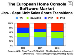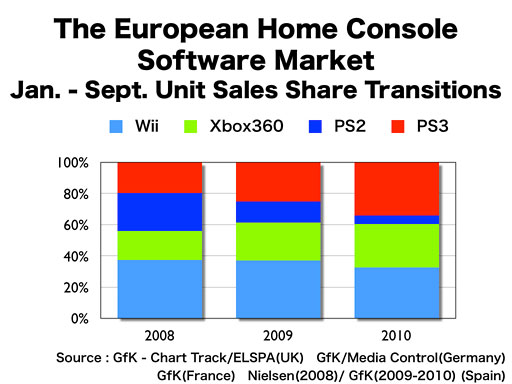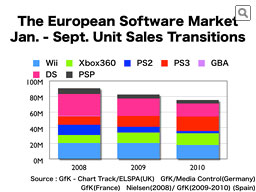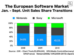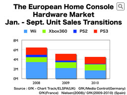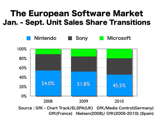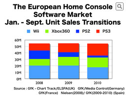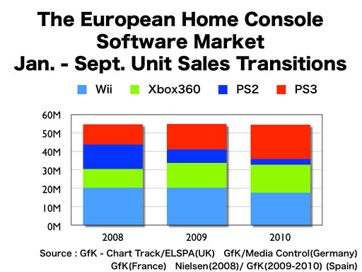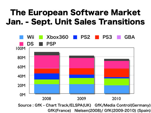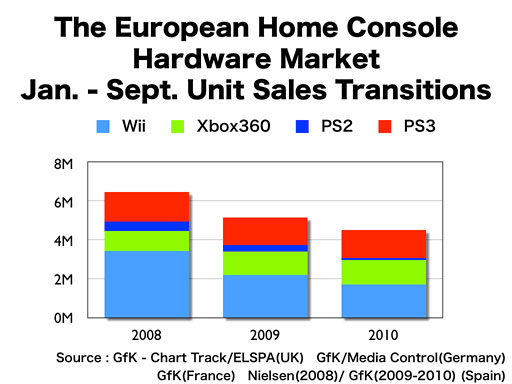 In this graph, Nintendo has gathered and tallied the home console video game hardware unit sales data for the January to September periods from 2008 to 2010, disclosed by independent research companies in the U.K., France, Germany and Spain. These four countries are assumed to represent 75% to 80% of the total European market, and I’d like to focus upon these figures to discuss pan-European trends.