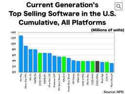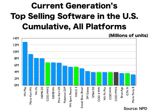 What we are looking at now is the graph for the top 20 software titles sold for all platforms in this generation in the U.S.. The blue bars are titles for Nintendo platforms, the green ones represent Microsoft and the gray ones are for Sony. Four titles from “Call of Duty” as well as “Grand Theft Auto” and “Halo” are the titles for other companies’ platforms, and all the other entrants are games for Nintendo platforms.