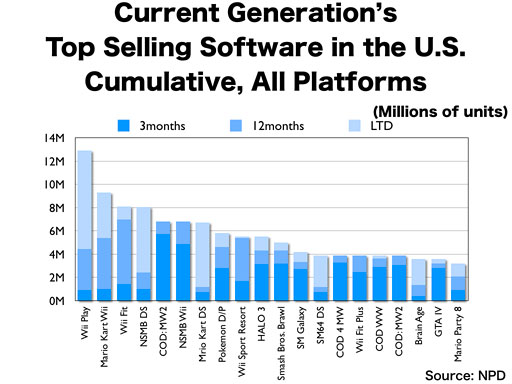 We have broken down the previous graph with different colors by how many units of each software title were sold within three months, 12 months and beyond the 12th month on the market. The three-month results can be largely affected if the software is launched in the year-end sales season or not, so it may not be a good indicator if the software belongs to the type of software which makes almost all of its lifetime sales in the launch period or if it is the long-tail type, but when we see the extended sales beyond the 12th month, you can see the unique presence of software for Nintendo platforms which have been selling even for years after their launches, just as I explained with the top software charts today. Such titles that we launched last year as "Wii Sports Resort," "Wii Fit Plus" and "New Super Mario Bros. Wii" are comparatively new on the market, so their sales beyond the 12th month are not outstanding yet, but we expect them to sell continuously on the market, just like other Nintendo titles did. We are also expecting the titles we launched this year, such as "Super Mario Galaxy 2" and "Wii Party," to follow the same trend.