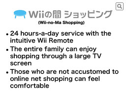 TV shopping and net shopping are nothing new today. However, with Wii-no-Ma Shopping, using the intuitive Wii Remote, you can enjoy shopping 24 hours a day on your TV at home. Unlike the online shopping on PCs, you can use the bigger screen of your TV, so all your family members can enjoy shopping together. In addition to exclusive commodities only available at Wii-no-Ma, there will always be more than 10,000 items to choose from, including foods, daily commodities, fashion items and furniture. Select items shall be shown with unique video presentations you’ll be able to watch. In addition to credit card payments, advance payments at convenience stores and cash-on-delivery payments that are widely available for online shopping, the consumers can telephone the call center to make the purchase order.