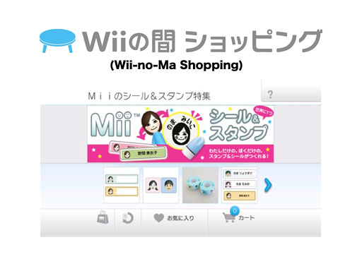 These are some examples of the goods that are exclusively available at Wii-no-Ma Shopping. You can order Mii stamps and stickers.