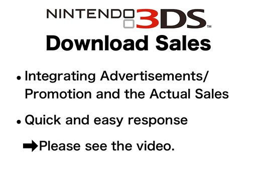 At Nintendo Conference 2010, I said that we were preparing the digital content download sales for Nintendo 3DS, we had integrated promotional and sales functions and that switching from one screen to another had become much quicker, so you would notice the quick response. It is as if we are now combining the functions of Wii Shop Channel and that of Nintendo Channels. With more swift and efficient responses, we want our consumers to feel like just enjoying a sort of window shopping even when they do not have any particular product in mind. We are preparing such a structure for Nintendo 3DS because we want to nurture a healthy download business in parallel with the packaged software sales. Due to the time restriction at Nintendo Conference 2010, I was not able to show this video to you then. Please take a look at this video which will hopefully tell you what kind of feeling you can get when you enjoy these download sales on Nintendo 3DS.