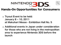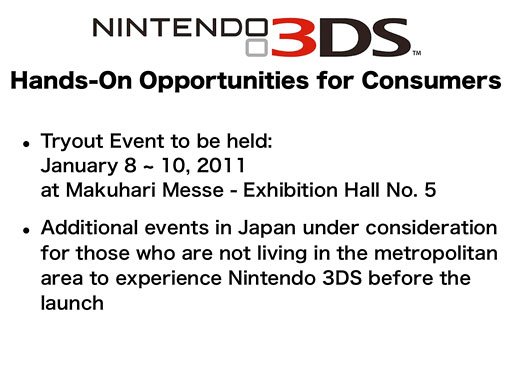 I was not able to disclose the details at Nintendo Conference 2010 as we had not finalized the schedule a month ago, but for our consumers in Japan to be able to get access to and have hands-on experience with Nintendo 3DS, we are going to hold a tryout event for consumers at Exhibition Hall No. 5 of Makuhari Messe in Chiba Prefecture on January 8, 9 and 10 next year. We will announce the details on our official website, but we are hoping that our consumers come to the event to experience and understand what kind of new gaming experiences are waiting for them when they can view these experiences in 3D without the need for special glasses, how different it will be from playing Nintendo DS games, and which software is going to be available for them at the launch and immediately afterward.