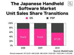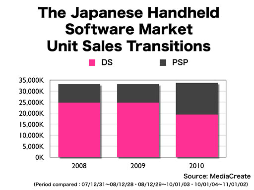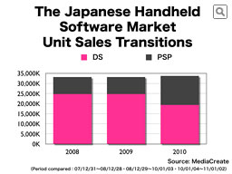 In 2010, "Pokémon Black" & "Pokémon White" for Nintendo DS made the fastest record in the industry to reach the five million unit sales mark, and "Monster Hunter" also sold very well as I said earlier. In addition, in Japan, a number of new titles were launched for PSP. Supported by PSP software sales, the Japanese software unit sales in 2010 showed a slight year-on-year increase.